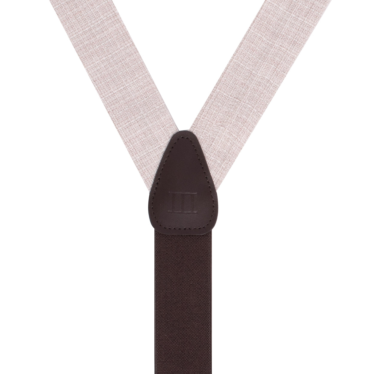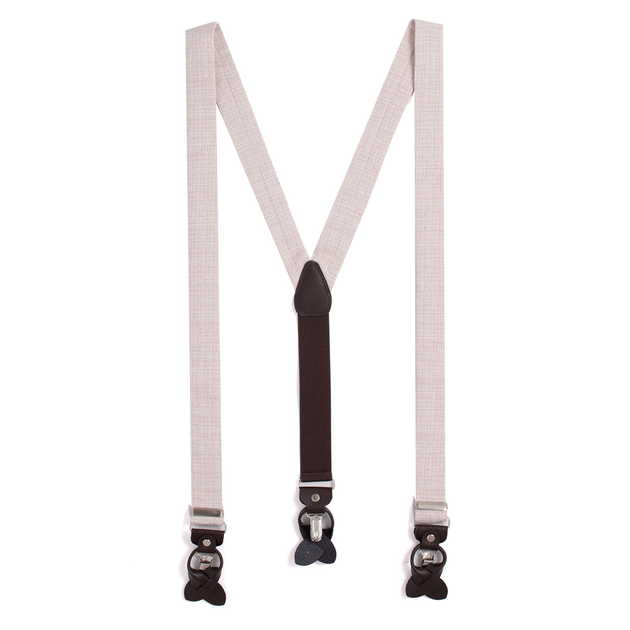 TRESANTI's CATENA suspenders in a textured fabric will complete any outfit. The straps are made of linen, cotton and polyester with brown leather details. This combination gives the suspenders a luxurious and stylish look. The sturdy clips make it easy to attach the suspenders to your trousers. Combine the CATENA braces with a matching bow tie and you will be ready for any special occasion. CATENA is available in ivory, light pink and light blue.