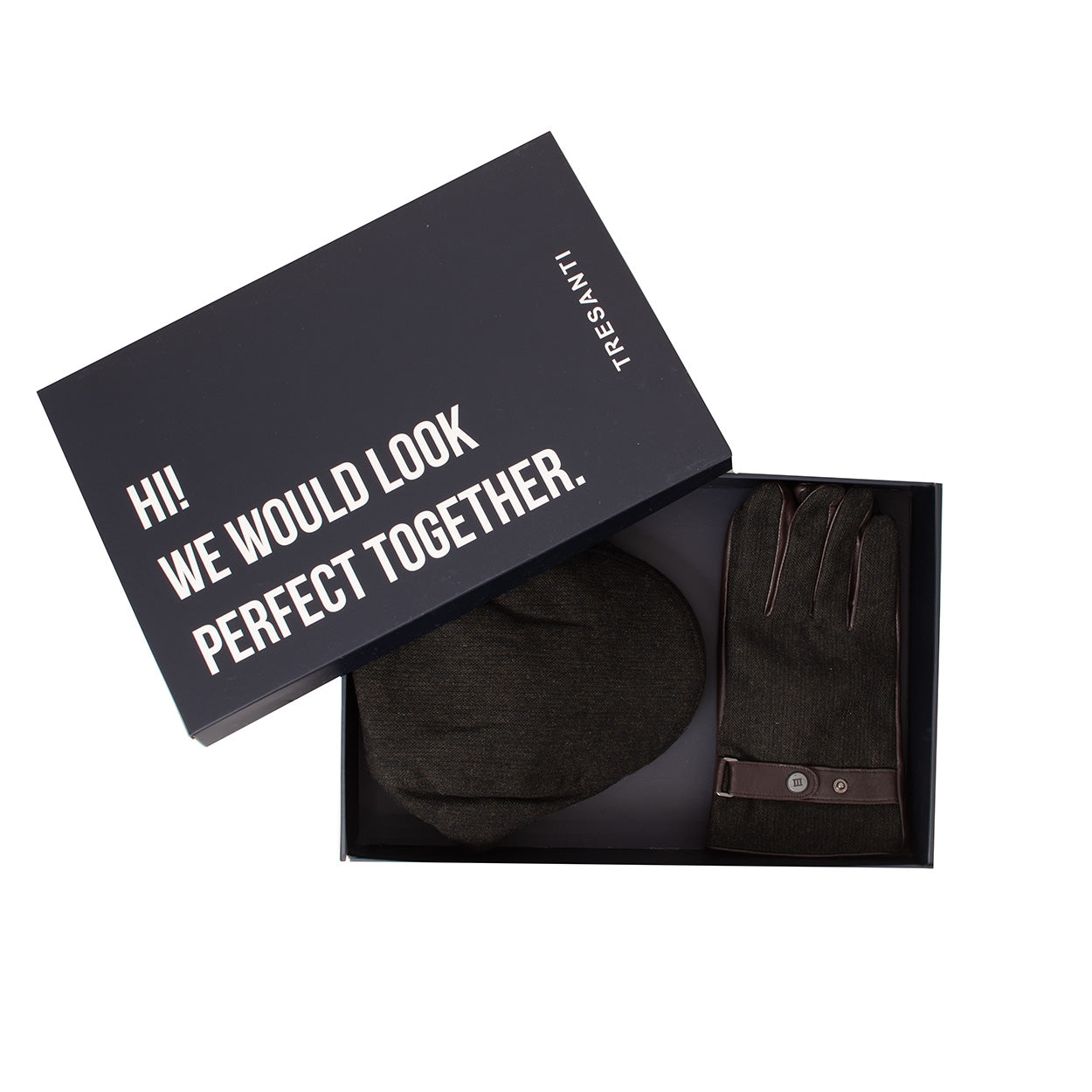 Make a statement with this stylish gift set from TRESANTI, which perfectly combines a classic flat cap and gloves. In a chic dark colour, the set exudes class and sophistication. With subtle details including a leather strap and metal button, the gloves offer both warmth and elegance. The matching flat cap completes the look for colder days. Presented in an elegant box with the text 'Hi! We would look perfect together', this set is the ideal gift for the stylish man.