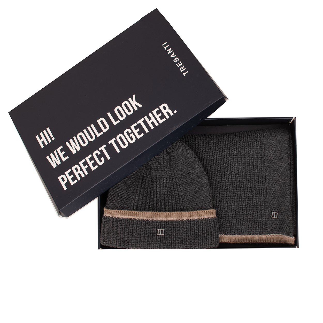 Surprise someone with the stylish FULSI gift set from TRESANTI. This set includes a soft, knitted scarf with a matching warm hat – perfect for cold days. An essential gift for every gentleman. The FULSI is available in beige, grey, dark brown and navy.