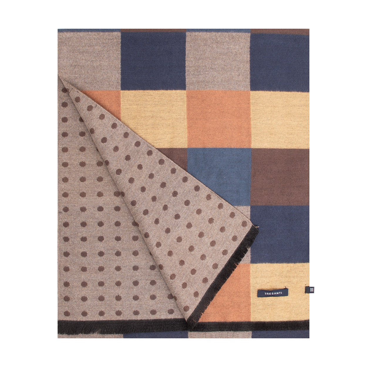 The STEVENS scarf adds sophistication to any outfit. With a blend of 80% viscose and 20% polyester, the scarf offers both warmth and comfort. This TRESANTI scarf is patterned on both sides. A large check pattern on one side and a polka dot pattern on the other. STEVENS is available in multi, brown and dark brown.