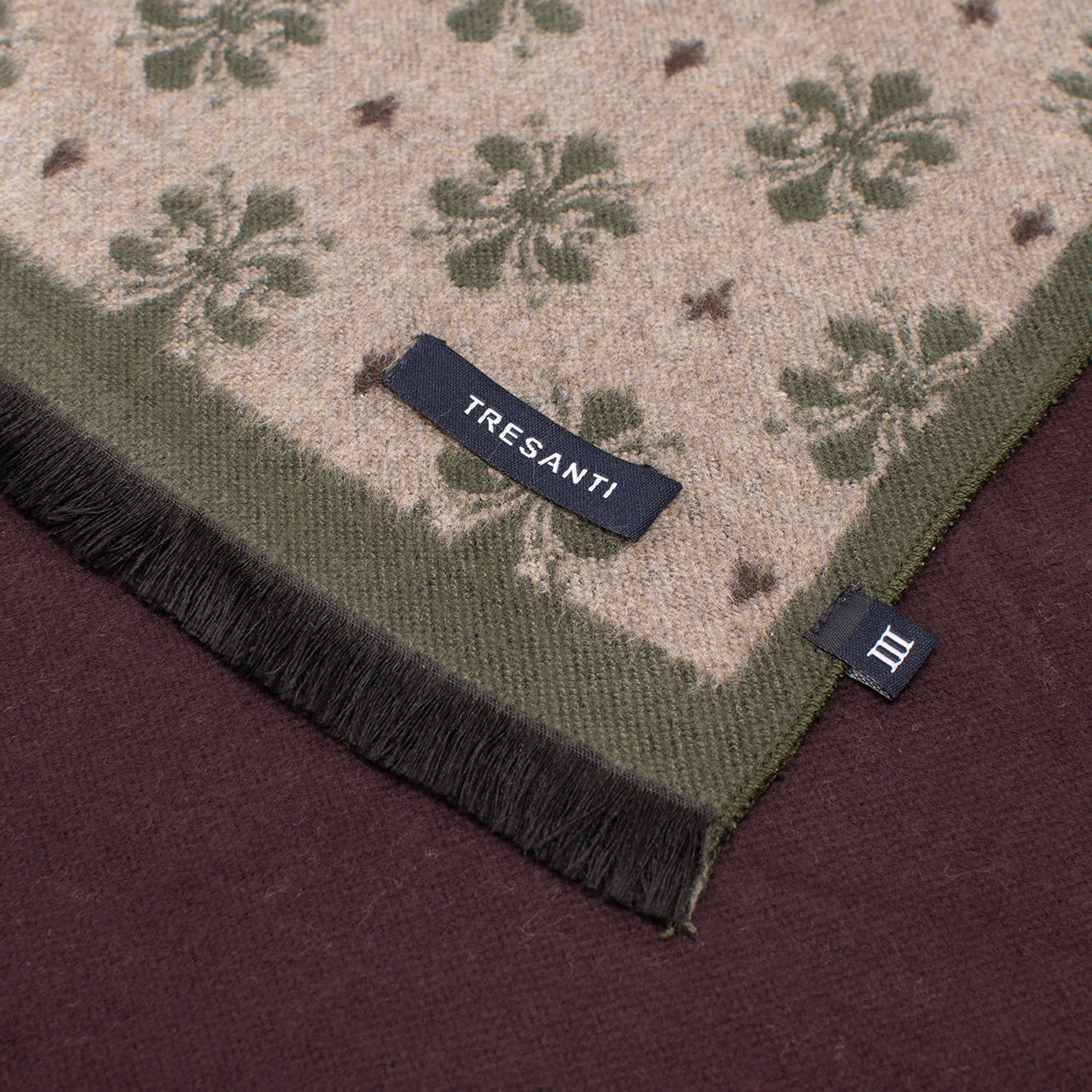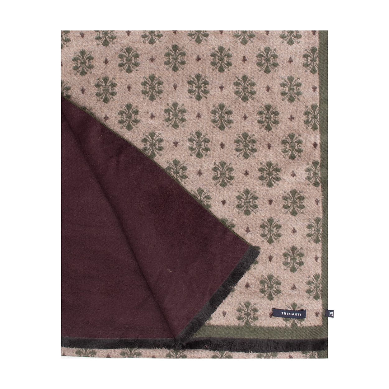 TRESANTI's BARAGAZZA scarf features an elegant, classic medallion pattern in subtle shades of moss green and beige, finished with a deep burgundy border. Perfect for both formal and casual occasions. The scarf is made from 80% viscose and 20% polyester. BARAGAZZA is available in moss.