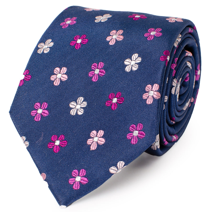 Brighten up your outfit with TRESANTI's BRON tie made from 100% silk. The tie features a subtle floral pattern in a variety of colours against a denim blue background. The BRON tie is available in red, purple, pink and blue.