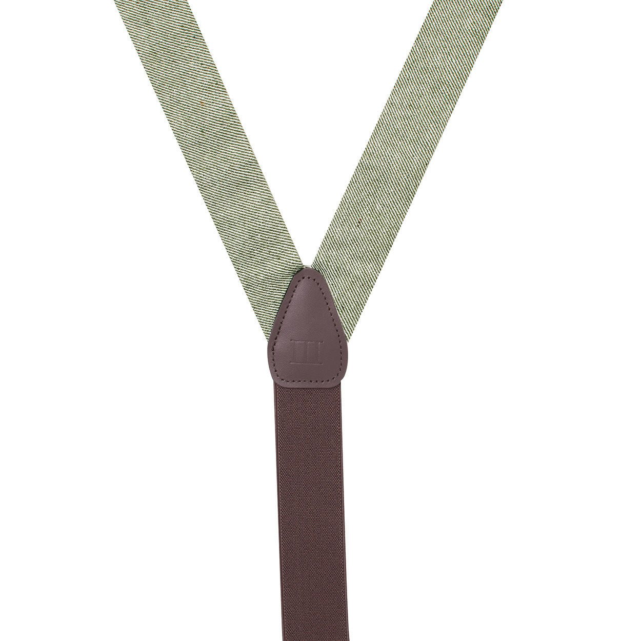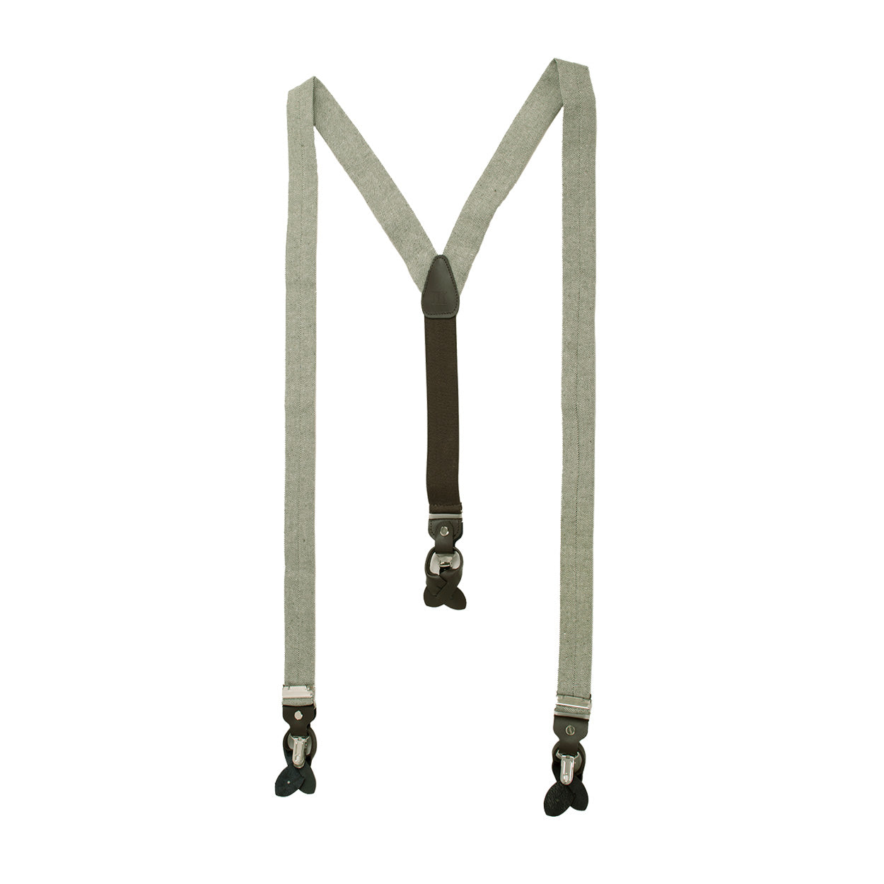 The summer ELANO braces from TRESANTI are made of twill fabric. The straps consist of a linen blend and are finished with brown leather details, giving them a rich, stylish appearance. The ELANO suspenders are available in off-white and green. Pair them with the matching flat cap, baseball cap, or bow tie to complete your outfit.