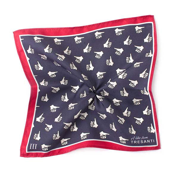Want to add some colour to your suit or outfit? Then the YANNICK pocket square by TRESANTI could be just the thing for you! The pocket square has a thumbs up print and is made from 100% silk, giving it a luxurious look. The YANNICK is available in a colour mix of navy and red.