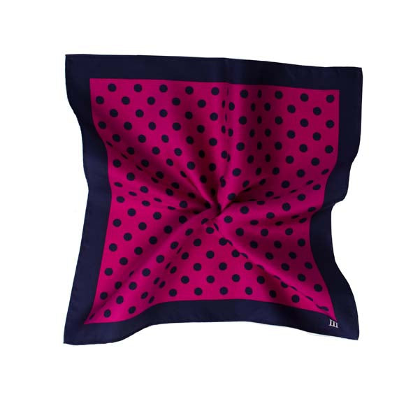YARO I Silk fuchsia pocket square with navy polka dots | Fuxia