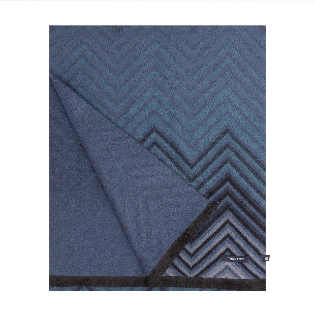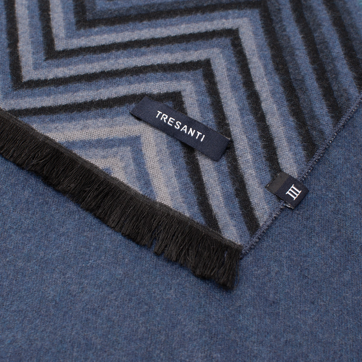 The DEMOCRITO scarf has a faded herringbone pattern. The TRESANTI scarf provides warmth and comfort for cold days. DEMOCRITO is available in multi brown and blue.