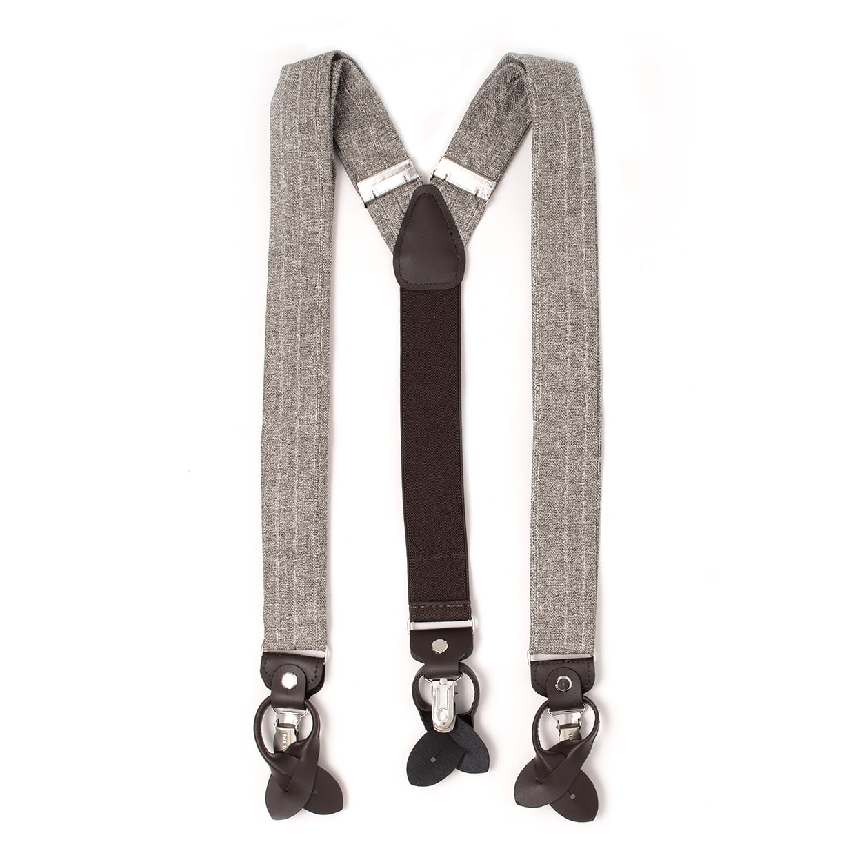 Add an extra detail to your outfit with the ELIAZ herringbone braces from TRESANTI. The straps are made of polyester and are finished with brown leather details and elastic for ultimate comfort. Thanks to the sturdy clips, the suspenders can be easily attached to trousers. Perfect for a formal wedding or a casual outfit. Match them with the matching flat cap, baseball cap, bow tie, pocket square, and tie to complete your look. Available in beige and light grey.