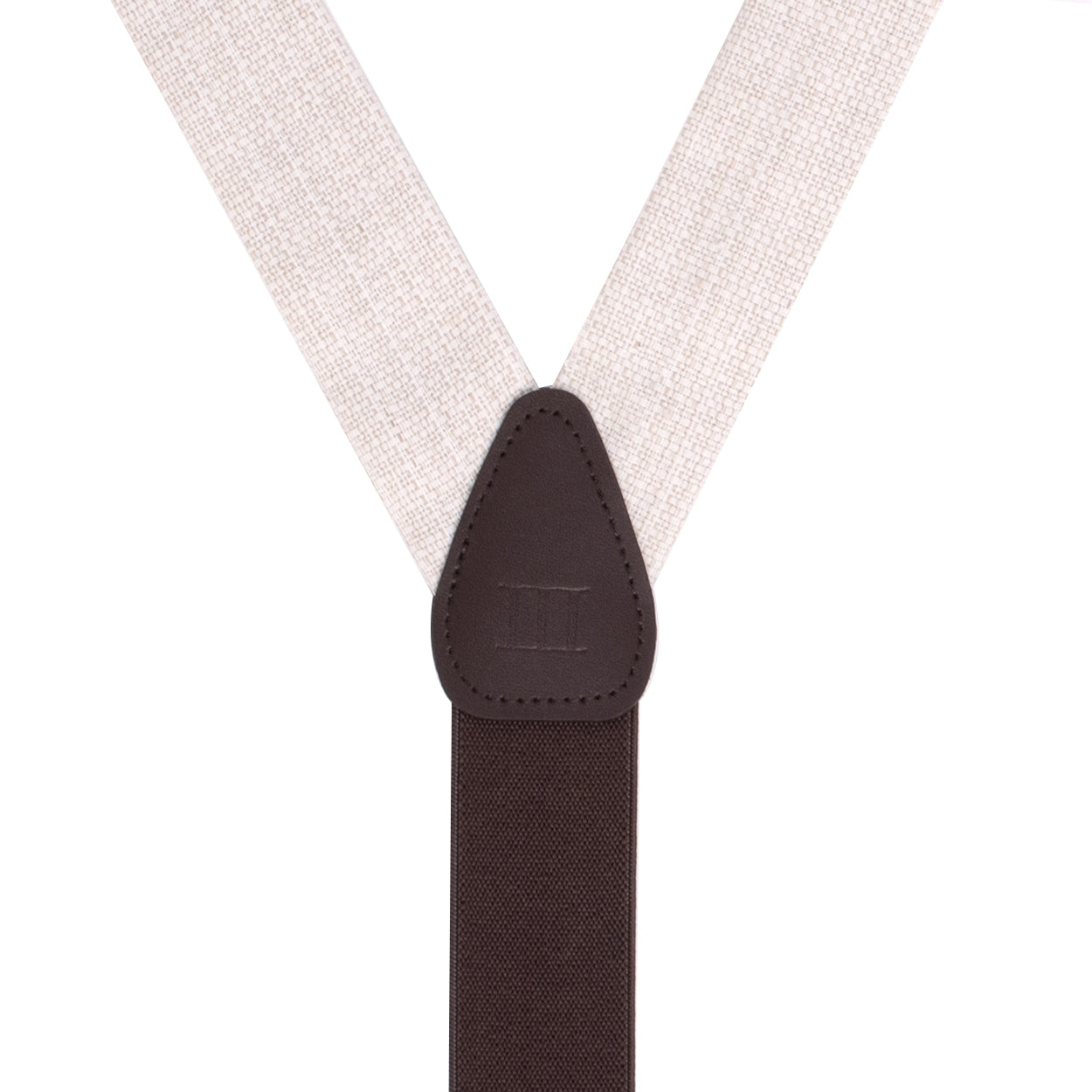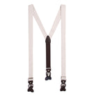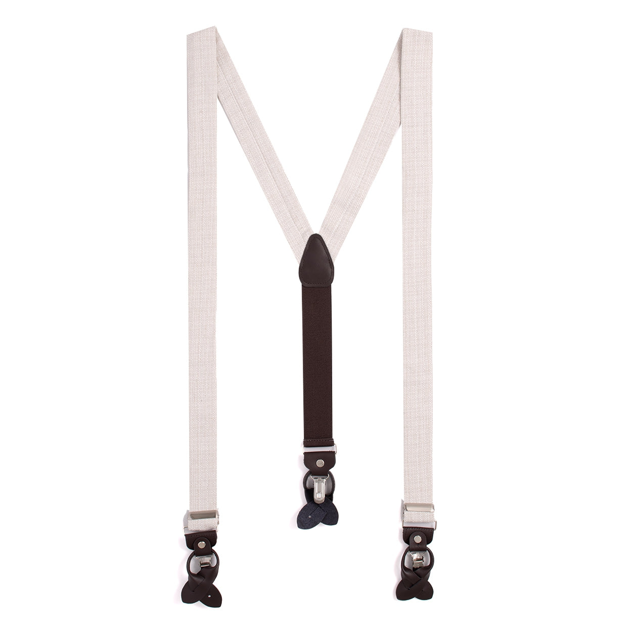 TRESANTI's CATENA suspenders in a textured fabric will complete any outfit. The straps are made of linen, cotton and polyester with brown leather details. This combination gives the suspenders a luxurious and stylish look.  The sturdy clips make it easy to attach the suspenders to your trousers. Combine the CATENA braces with a matching bow tie and you will be ready for any special occasion. CATENA is available in ivory, light pink and light blue.